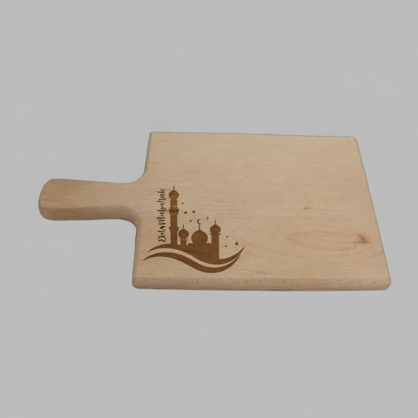 Breng elegantie naar de eettafel met deze exclusieve Eid Mubarak serveerplank. Deze plank is niet zomaar een keukenaccessoire, maar een blijvende herinnering aan mooie momenten met familie en vrienden. De gravure is met precisie aangebracht, waardoor de moskee en de sterren prachtig afsteken tegen de natuurlijke houtnerf.