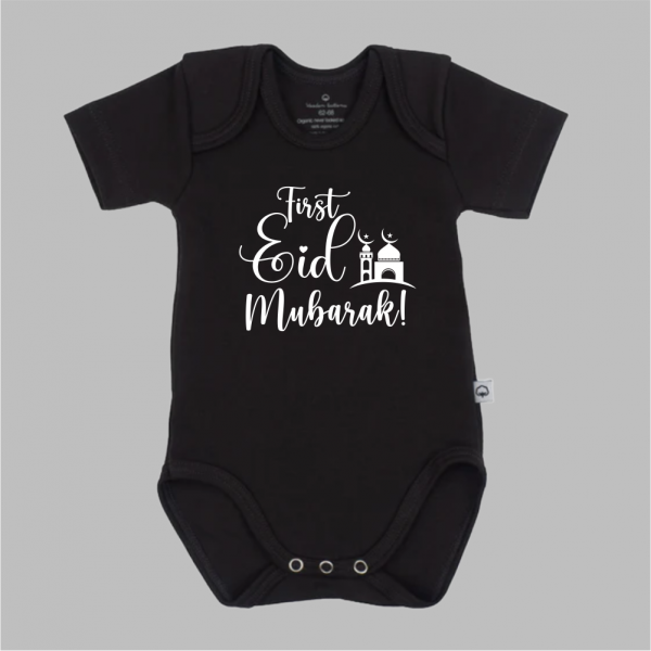 Maak de eerste Eid van je kleintje extra speciaal met deze schattige witte baby romper met de tekst “First Eid Mubarak!”